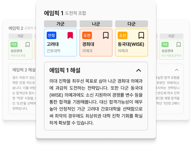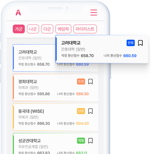 학생의 강점과 각 대학별 유불리를 날카롭게 꿰뚫어보는 에임의 알고리즘은 성적표에 갇힌 숨은 기회를 절대 놓치지 않습니다.